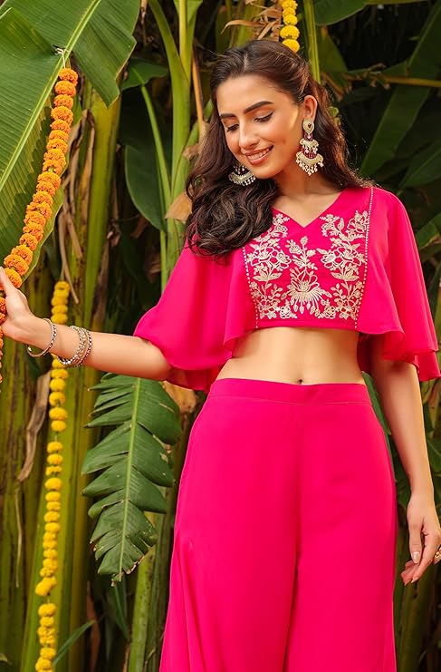 Janasya Indian Women's Georgette Pink Yoke Embroidered Festive Wear Co-ord Set for Women