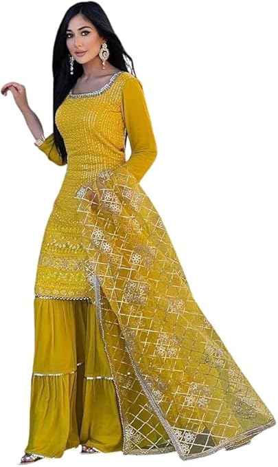 Beautiful Chinnon Punjabi Style Sharara Suit For Women Ready To Wear Salwar Kameez With Dupatta